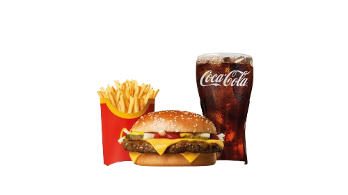 Pravá klasika. Velký plátek grilovaného hovězího masa v žemli sypané sezamem. K tomu hořčice, kečup, čerstvá cibule, okurka a dva plátky s čedarem. Nezapomenutelná chuť. Velký Nápoj + Velké Hranolky.